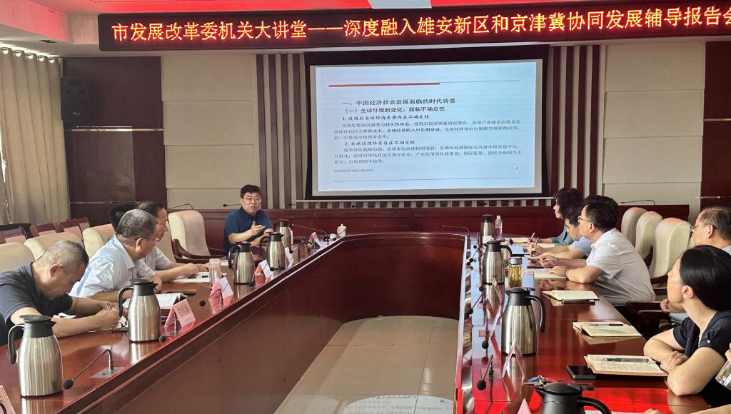 6月16号下午,院长葛金田在德州市发改委机关大讲堂内,作了题为《深度融入雄安新区和京津冀协同发展》辅导专题报告。报告指出,德州地处山东省“北大门”,与河北省沧州、衡水两地地缘相近、人文相亲,是融入京津冀协同发展的重要区域,德州市物流业的发展,不仅要引入地区优势物流企业,更要基于德州农业资源禀赋以及良好的区位优势,把握京津冀协同发展重大机遇,深度融入雄安新区,瞄准市场需求,努力规划打造雄安-山东农产品冷链物流产业园做为发展重点。德州市发改委全体成员现场听取了报告。
