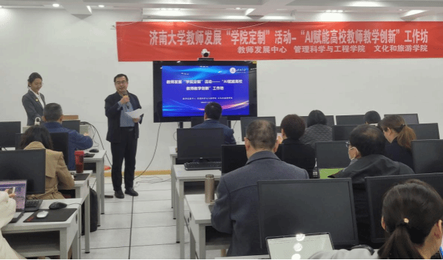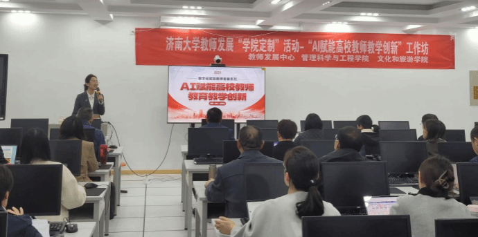 2024年11月12日下午,ai做爱 联合教师发展中心、文化和旅游学院在经管楼302机房举办"AI赋能高校教师教学创新”专题讲座,学院全体教职工参加,讲座由常相全教授主持。