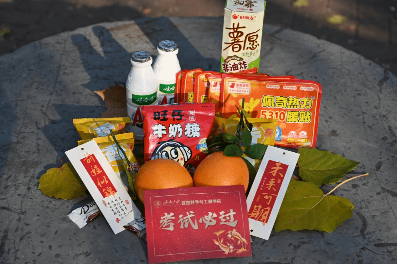 学院精心为考研学子准备的考试大礼包,内含十件物品,代表了十全十美。每一个物品都有深深的寓意。其中德芙巧克力寓意巧克难关;娃哈哈AD钙奶寓意开心备考;脐橙象征“脐”开得胜,心想事“橙”;薯愿薯片意为愿望成真,所求皆所愿;锅巴寓意考试稳过;旺仔牛奶糖寓意福气“旺旺”;暖宝宝贴带来“暖”意融融;加油鸭子为大家加油,一起努力;心愿书签写满了对学生们的真切祝福;还有精致的礼品袋,日夜兼程,金榜题名。