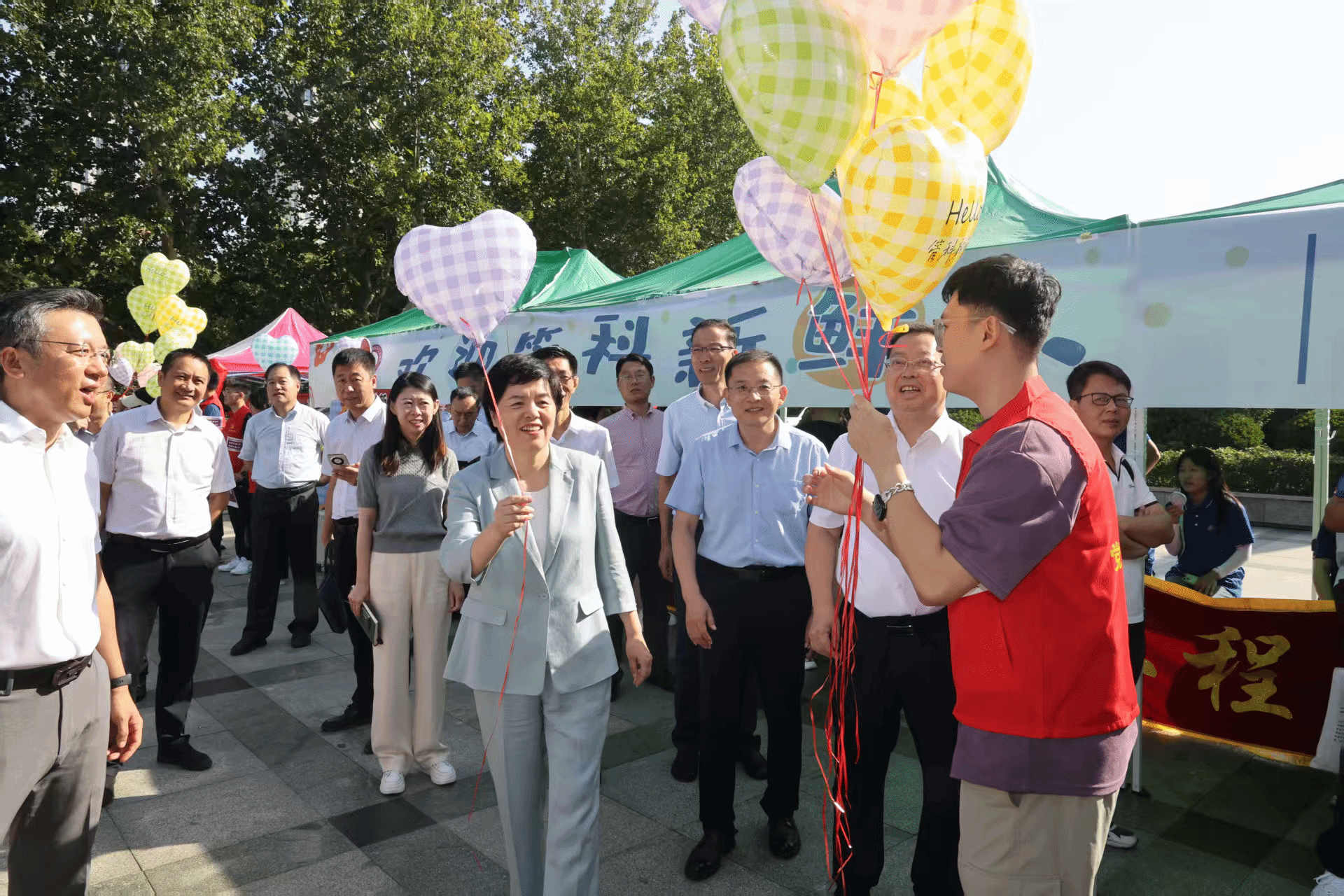 志愿者们举着迎新的标牌