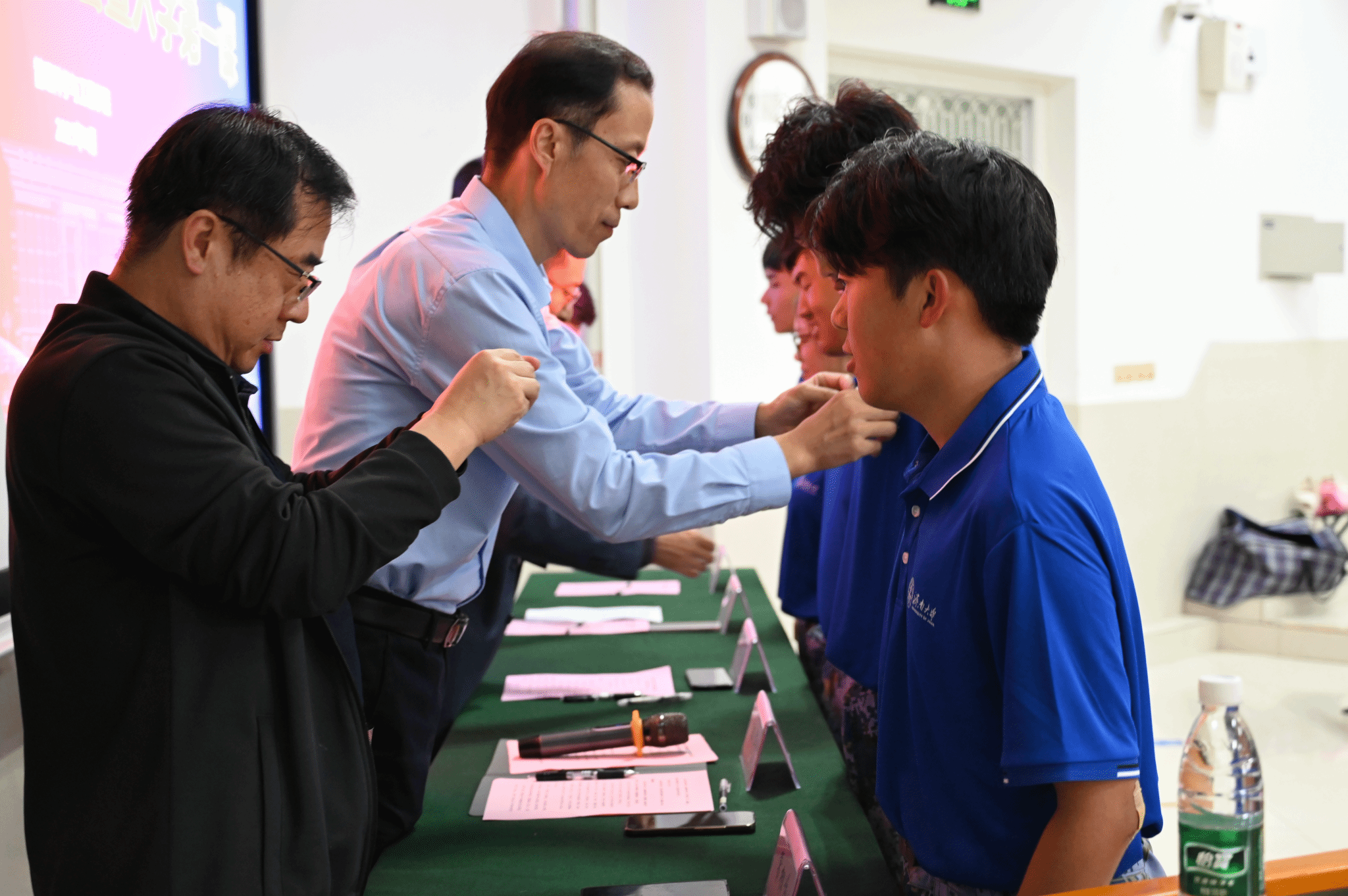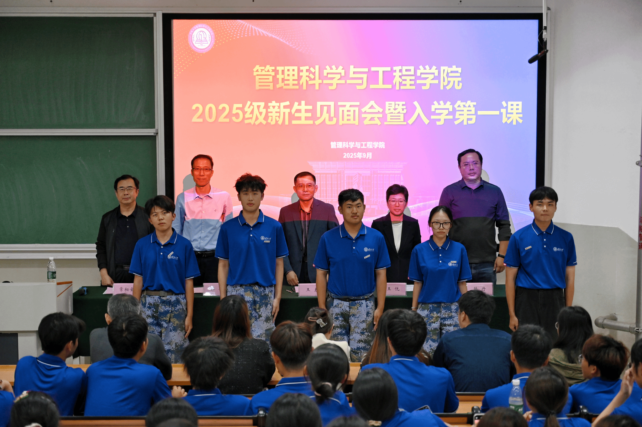 见面会在庄严的国歌声中开始。院长助理常相全教授对学院各专业情况进行介绍,从学科布局、培养模式、专业优势等方面进行了系统讲解,让新生对学院专业有了直观且深入的认识。在校生代表信管 2201 班李惠泽结合自身大学学习生活经历,从学业规划、校园活动、能力提升等方面进行经验分享。新生代表应管 2502 班原浩轩表达了对大学生活的期待与自身的规划愿景,展现出新生群体的蓬勃朝气。活动中,学院领导集体为新生代表佩戴校徽。
