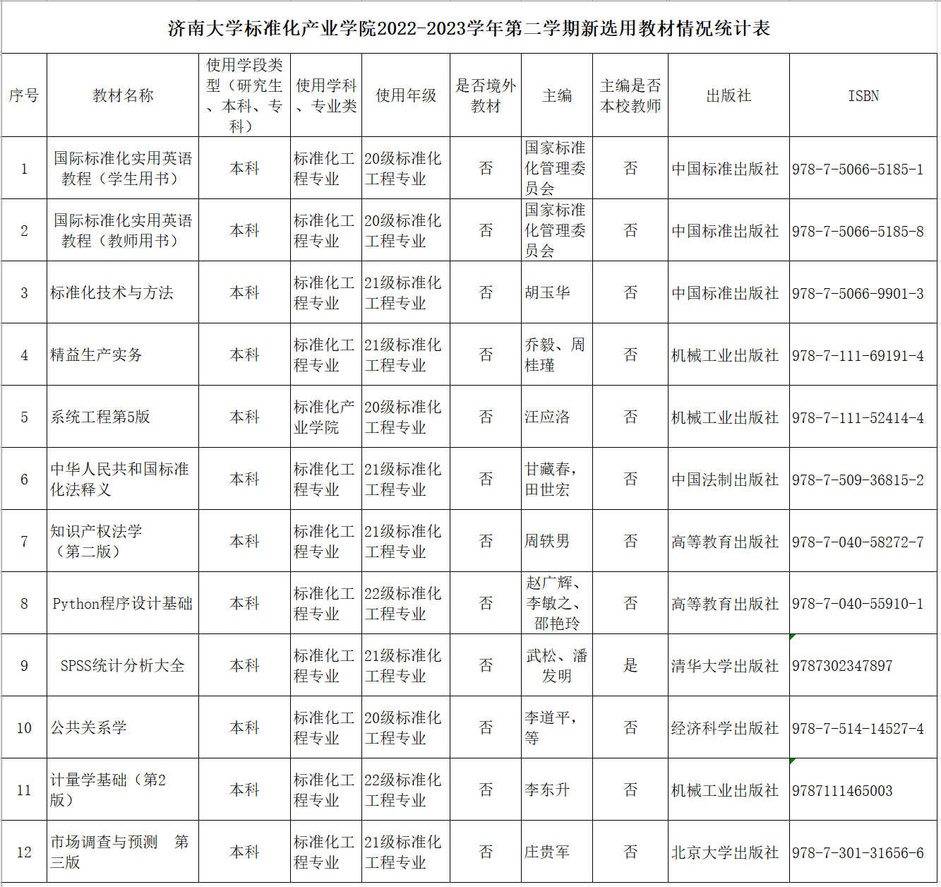 ai做爱 标准化产业学院2022-2023学年第二学期新选用教材情况统计表
