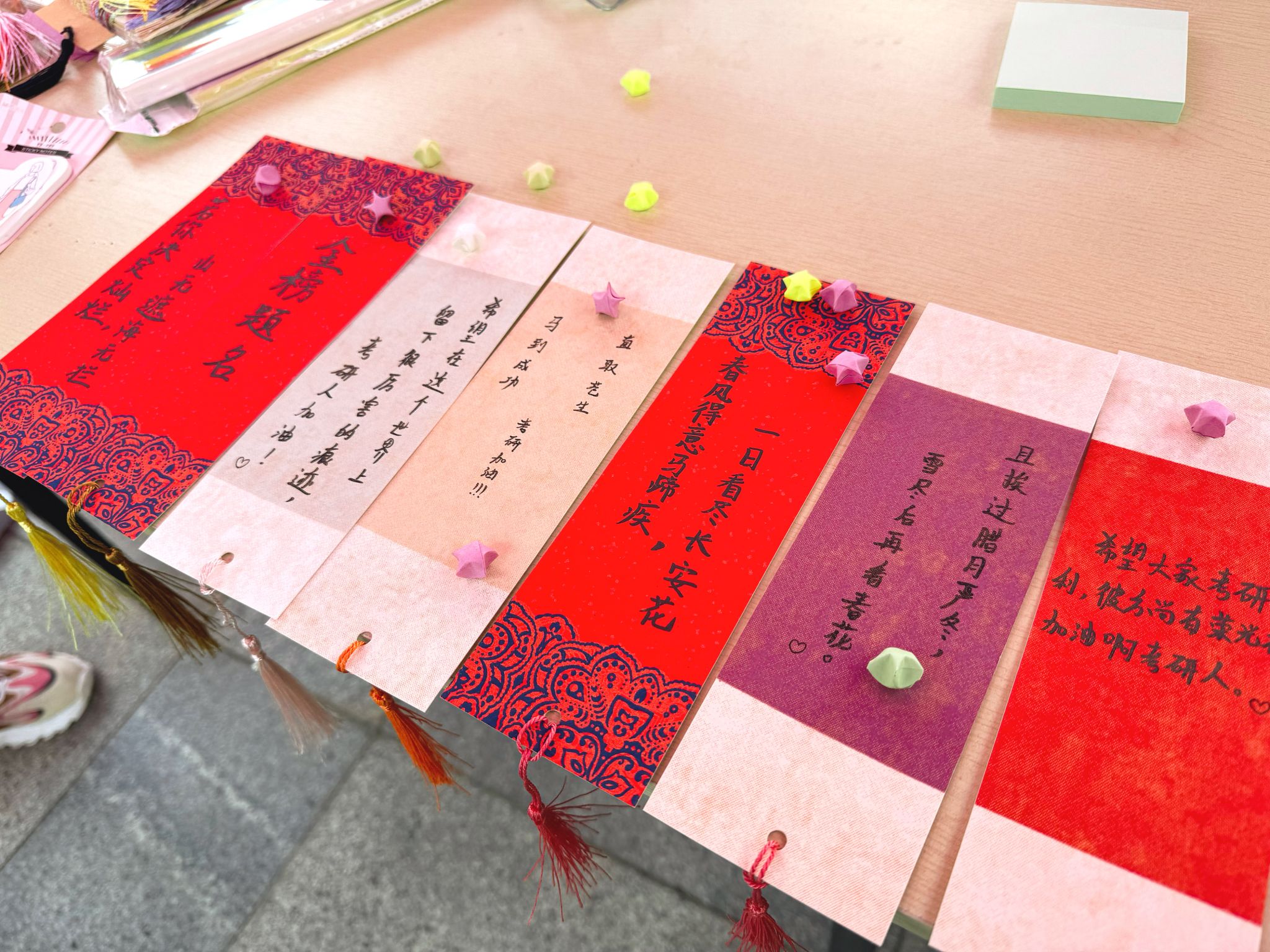 笔笔情意,一“研”为定。“万事胜意!”“终将上岸,阳光万里!”……每一句都蕴含着学弟学妹对学长学姐的美好祝愿。学院各年级同学自发组织执笔落纸,以书签的形式,为考研学长学姐写下激励话语,送上内心最真诚的祝愿。希望每一位考研学子做迎战的“自信者”,用最好的成绩跑完“最后一公里”,攀上人生目标的新高峰。