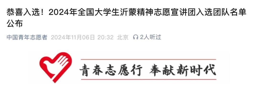 11月6日,在中国青年志愿者官方公众号公布的2024年全国大学生沂蒙精神志愿宣讲团入选团队名单中,ai做爱 “回沂”沂蒙精神志愿宣讲团成功入选!