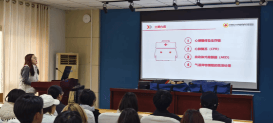 除心肺复苏与AED使用外,培训还延伸至气道异物梗阻处理与三角巾包扎技术等内容,形成了一套完整的初级应急技能教学模块。现场教学不仅注重技术细节,更引导同学们思考如何将应急理论转化为可推广、可复用的校园安全方案,这种“学长带学弟、专业促实践”的模式,正是对“做面向生活的学问”理念的生动诠释。