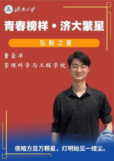 曹豪洋学长是一个不畏困苦,不甘平庸的追光者。他两次获得济大繁星——弘毅之星,他在经济上寻求独立,通过勤工助学和课外兼职等方式获得劳动报酬,表现出顽强向上的毅力和积极乐观的精神;在生活中孝敬父母,承担起家庭重任,为父母分愁解忧;在学习上刻苦努力,成绩优异,学年综合测评成绩居专业年级排名前列。学长的优秀事迹值得我们借鉴和学习,他不畏艰难,宽宏坚毅,奋发图强,立志于改变当前困境,他的故事带给我们动力。